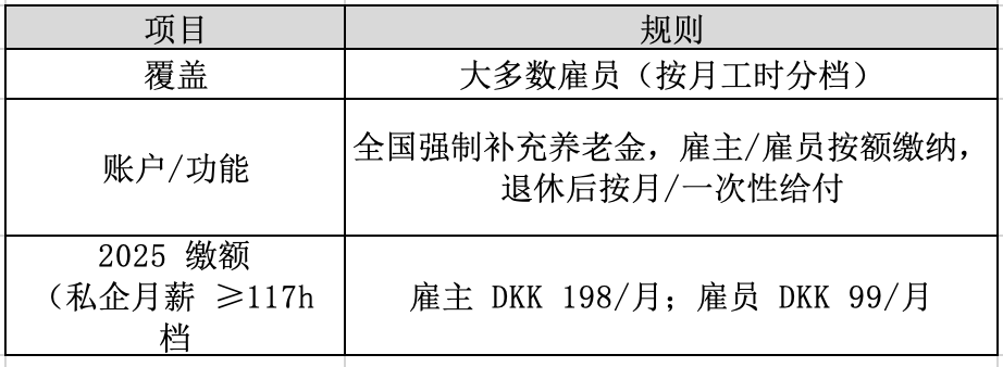 丹麦福利高度税收化,无“社保五险”式的工资比例统缴;但雇主依法需承担 ATP(补充养老金)、工伤保险/AES、产假均衡基金(Barsel.dk/行业基金)、职业教育/AUB 等固定/按额或按类成本