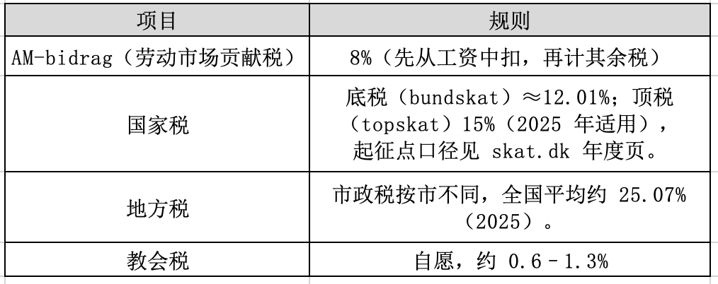 个人所得税: 一般对丹麦来源所得课税;具体税率/方案以 skat.dk 当年规则为准。