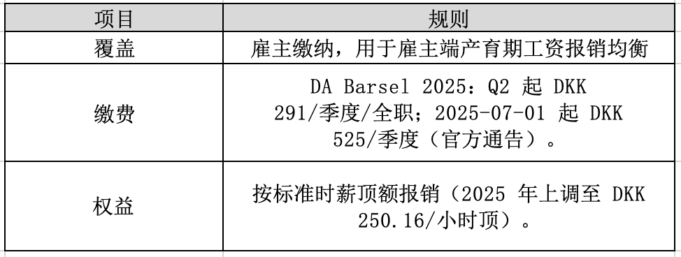 产假:产前4周+产后配额+父母共享,福利由国家日津贴与均衡基金承担;行业协定多会补足。均衡基金自2025年5月起上限为DKK 250.16/小时