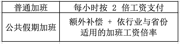 加班工资:每天 2-3 小时,每周 8-12 小时,视行业和省份而定。
