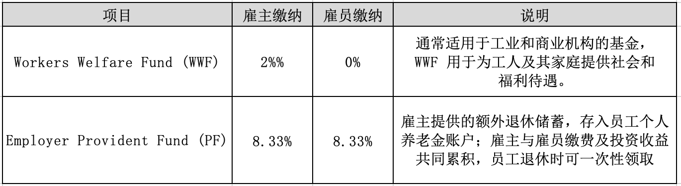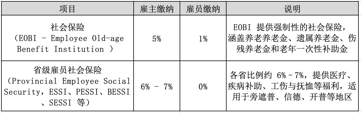组成: 社会保险(EOBI)5% + 省级雇员社会保障(根据地区 6–7%)+ 工人福利基金(WWF,适用于产业工人)2% + 员工公积金(非强制)8.33% = 11% – 22.33%