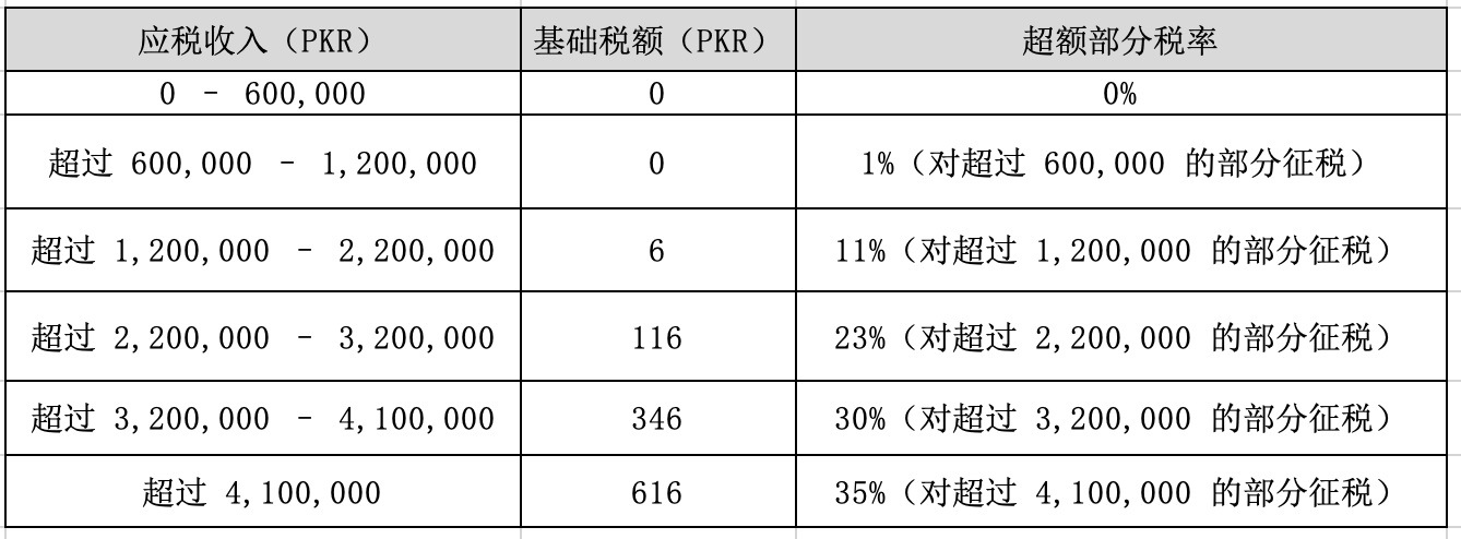 个人所得税:巴基斯坦的居民与非居民纳税人适用相同的税率;但居民需就其全球所得纳税,而非居民仅就其在巴基斯坦境内获得的收入缴税。